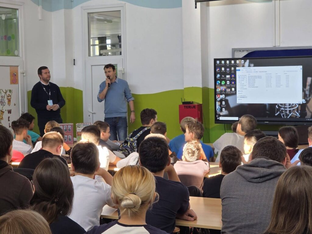 U srijedu, 05.11.2025. povodom Mjeseca hrvatske knjige našu je školu posjetio književnik i urednik Vid Jakša Opačić. Ovog divnog gosta doveo je i srdačno predstavio njegov dugogodišnji prijatelj, naš učitelj Nikola Balaško.
